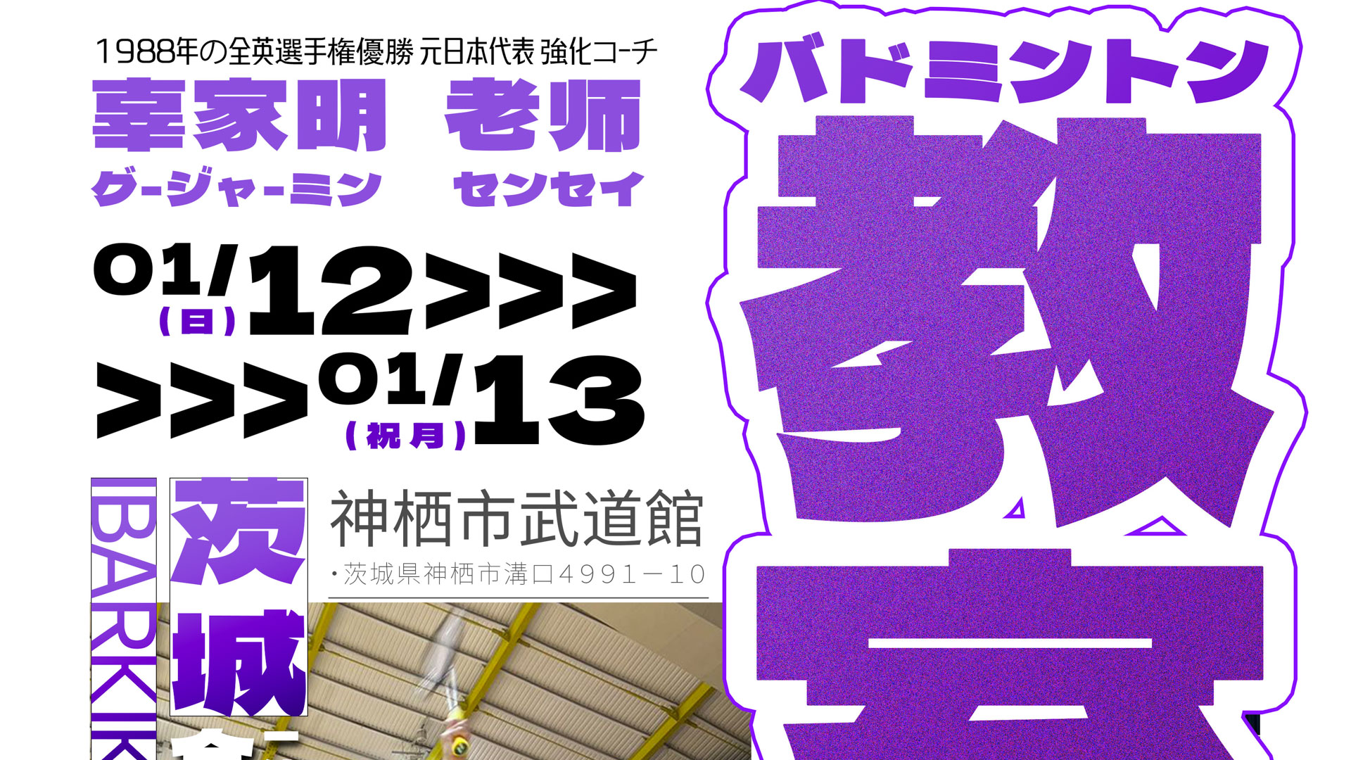 世界チャンピオンのグージャーミン氏及び実業団選手を招いて、小学生を対象にしたバドミントン合宿及び強化練習会を開催致します。